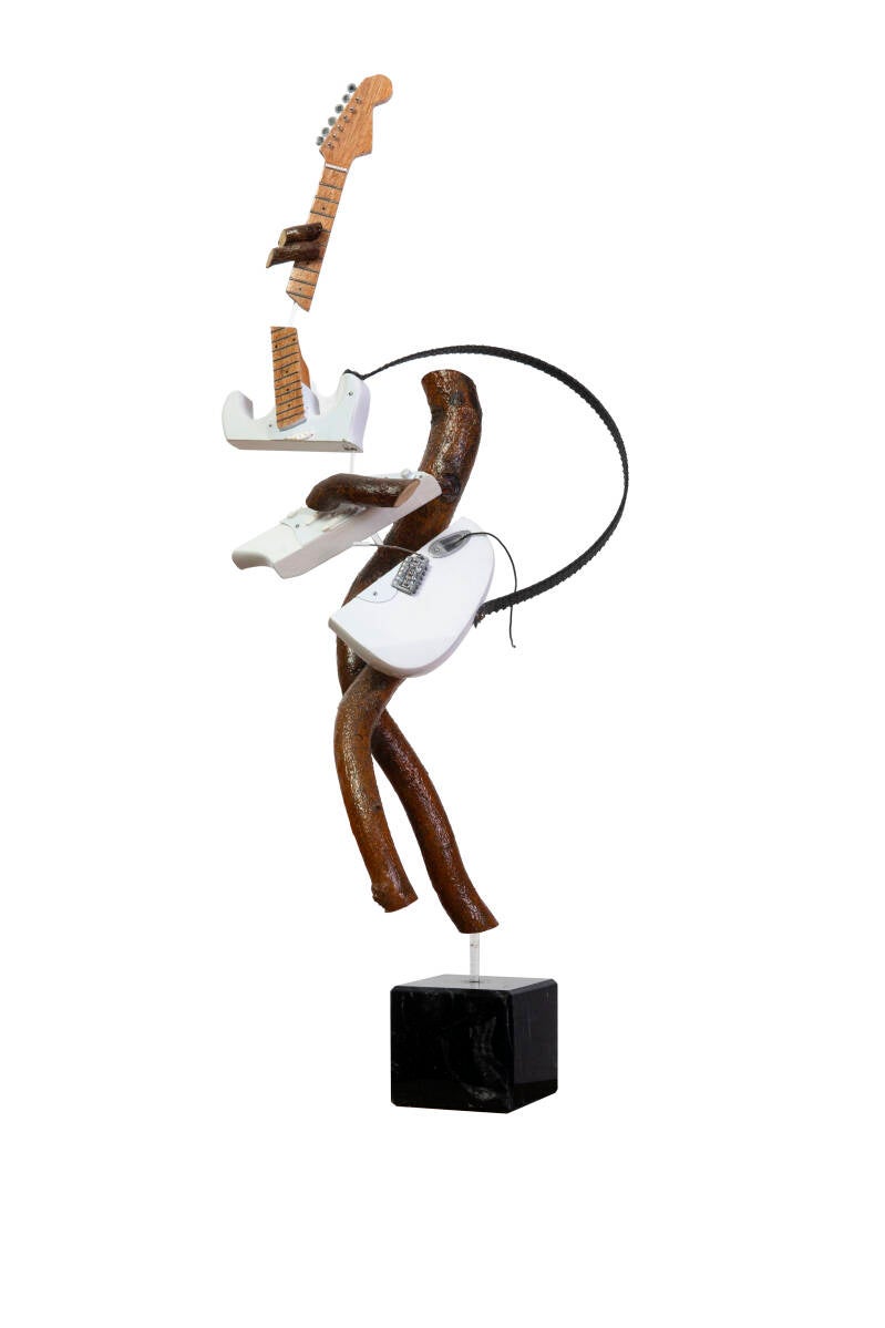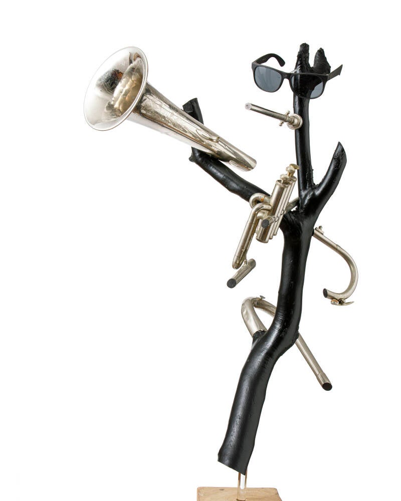 In combinatie met stukken hout van fruitbomen en wilgen levert dat een muzikant op, die vol enthousiasme zijn instrument bespeelt.