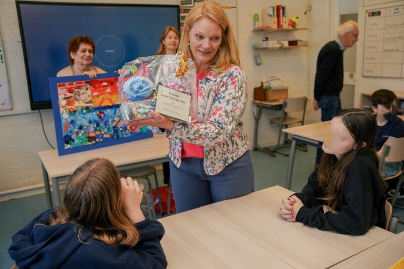 De eerste prijs werd uitgereikt door Wethouder Zorg & Welzijn, Klimaat & Energie, Charlotte van der Meij. Zij overhandigde de prijs persoonlijk in de klas aan groep 8 van Basisschool De Linq. Alle deelnemende leerlingen mogen hun kunstwerken tentoonstellen tijdens MEER-art 2026 en later dit jaar krijgen de kunstwerken bovendien een plek in een expositie bij Cpunt.