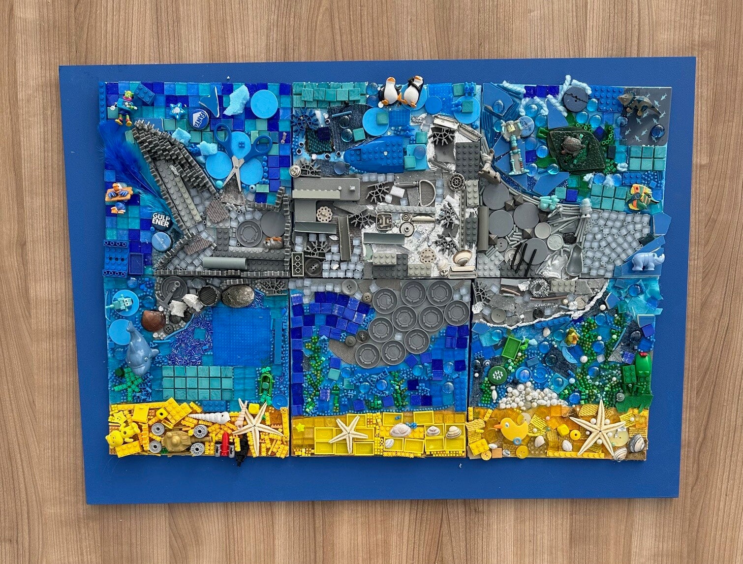 "De jury heeft niets dan lof over jullie kunstwerk. De voorbereiding was al geweldig, jullie hebben zoveel mooie kleuren gebruikt en het werk heeft heel veel details. Er is veel verschillend materiaal gebruikt, alles is volgeplakt en de jury is zwaar onder de indruk van het mooie verloop van de kleuren in jullie werk (vooral het oranje, rood en roze). Ze vinden de boot en het vliegtuig geniaal gemaakt maar ook de vis met al die kleuren is prachtig gemaakt. Het is duidelijk een klas met veel fantasie. Jullie zijn dus de terechte winnaars en de jury maakt een diepe buiging voor jullie.