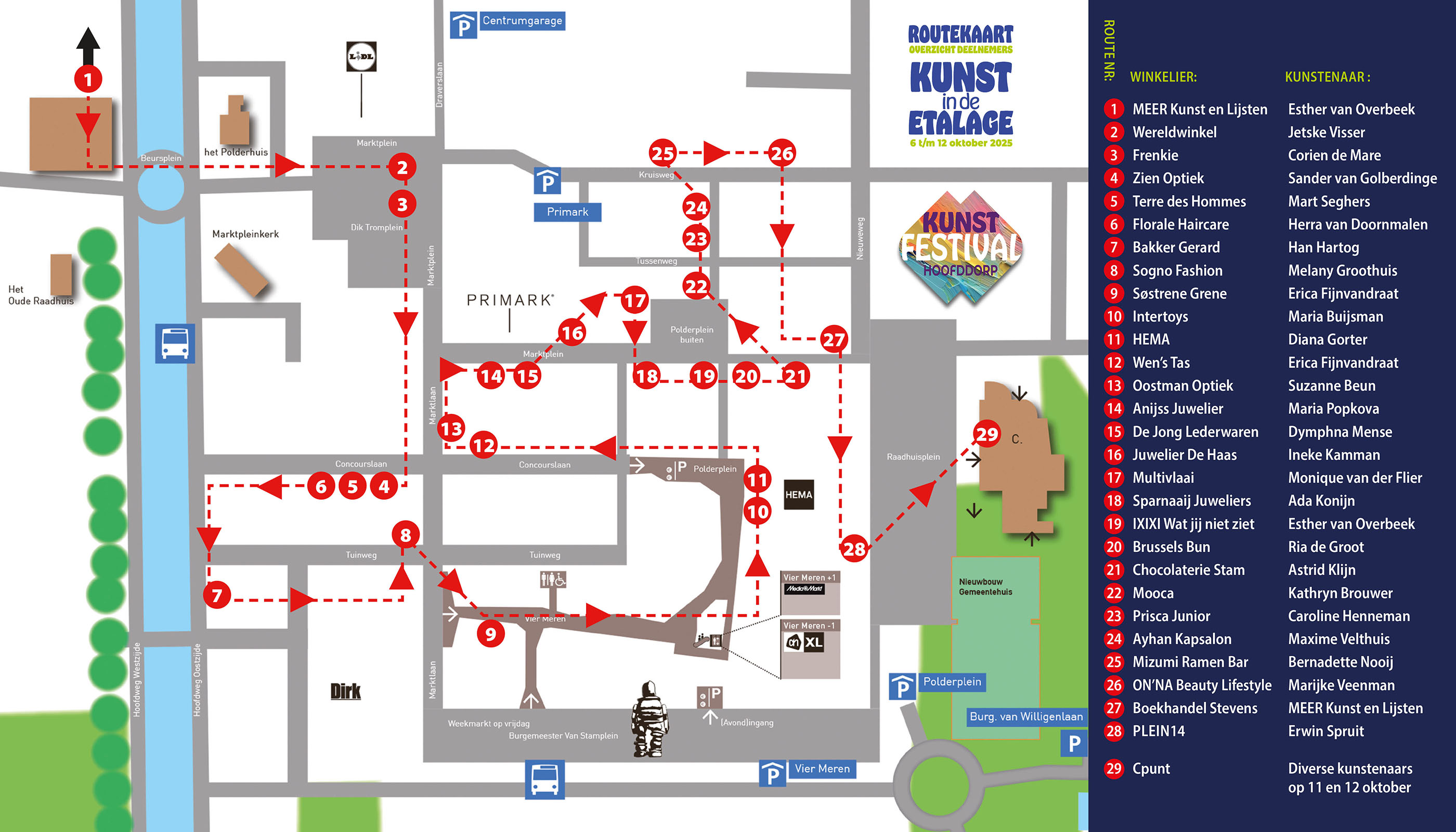 Hieronder vind je de route van "Kunst in de Etalage" die je van 6 tot en met 12 oktober 2025 kunt volgen in Hoofddorp Centrum als onderdeel van het Kunstfestival. Ook tref je een lijst aan met de winkeliers en kunstenaars die hieraan meedoen. De folder met route is die week eveneens te verkrijgen bij de deelnemende winkeliers.