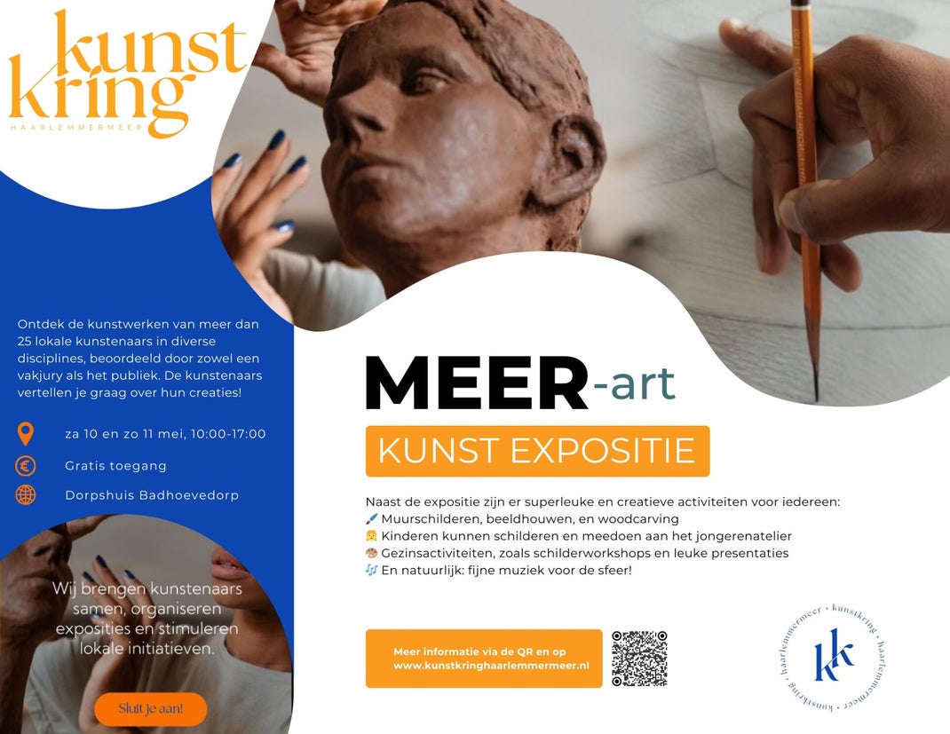 MEER-art 2025 was een succes. De organisatie van dit mooie kunstevenement lag in handen van ons erelid Piet Dees en de Haarlemse kunstenaar Peter Mulder met medewerking van de Stichting Galerie Kunst 2001 en de Stichting Maatvast. Na vele maanden voorbereiding was het op zaterdag 10 mei dan zover. In het Dorpshuis Badhoevedorp kwamen vele kunstenaars van Kunstkring Haarlemmermeer bijeen om hun beeldende kunst een weekend lang te exposeren. Het was uniek omdat het de eerste keer was dat zoveel beeldend kunstenaars in Haarlemmermeer bijeenkwamen.
