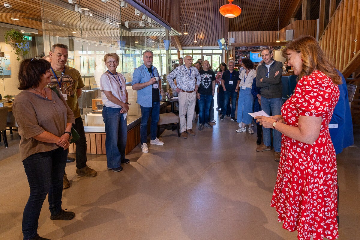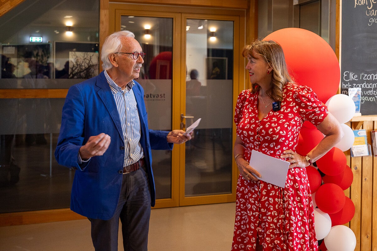 Ook op de eerste verdieping was Piet Dees te vinden die vertelde over het plaatsen van het metersbrede en -hoge kunstwerk dat langs de Driemerenweg staat, genaamd de Waterwolf en wat allemaal heeft meegespeeld om dit gigantische beeld op die plek te krijgen.